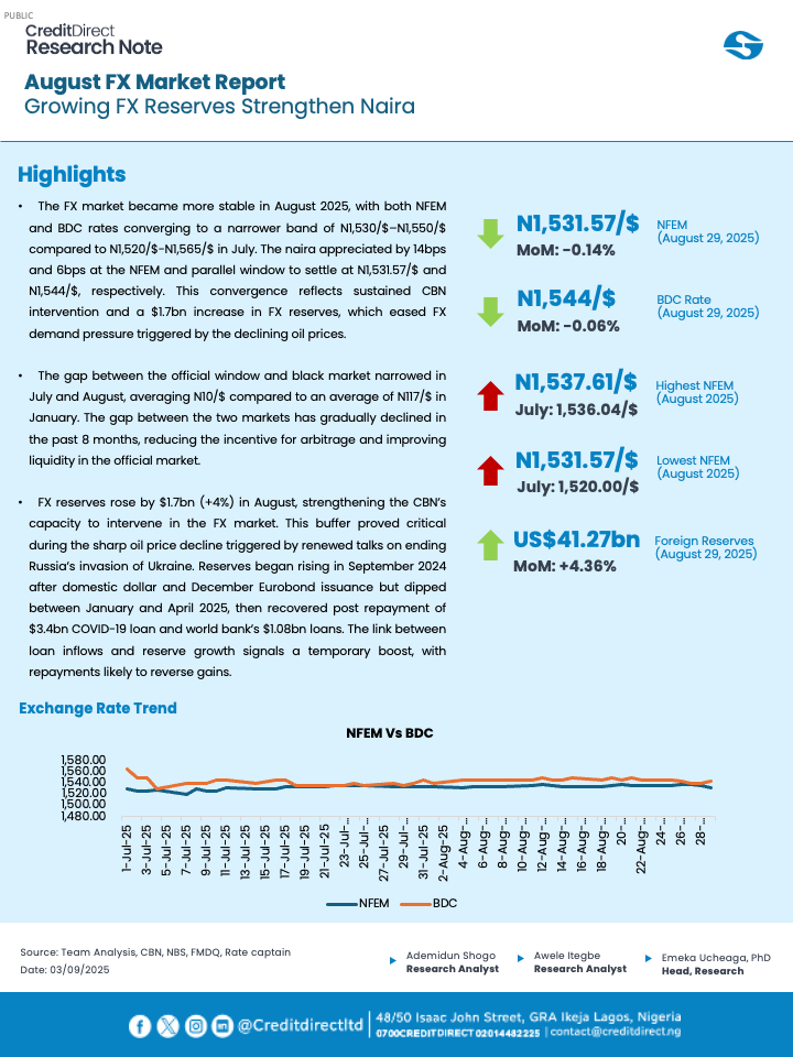 Nigeria’s foreign exchange market showed stronger signs of stability in August 2025. Supported by CBN interventions and a notable boost in FX reserves, the Naira held firmer ground even as oil prices slipped.