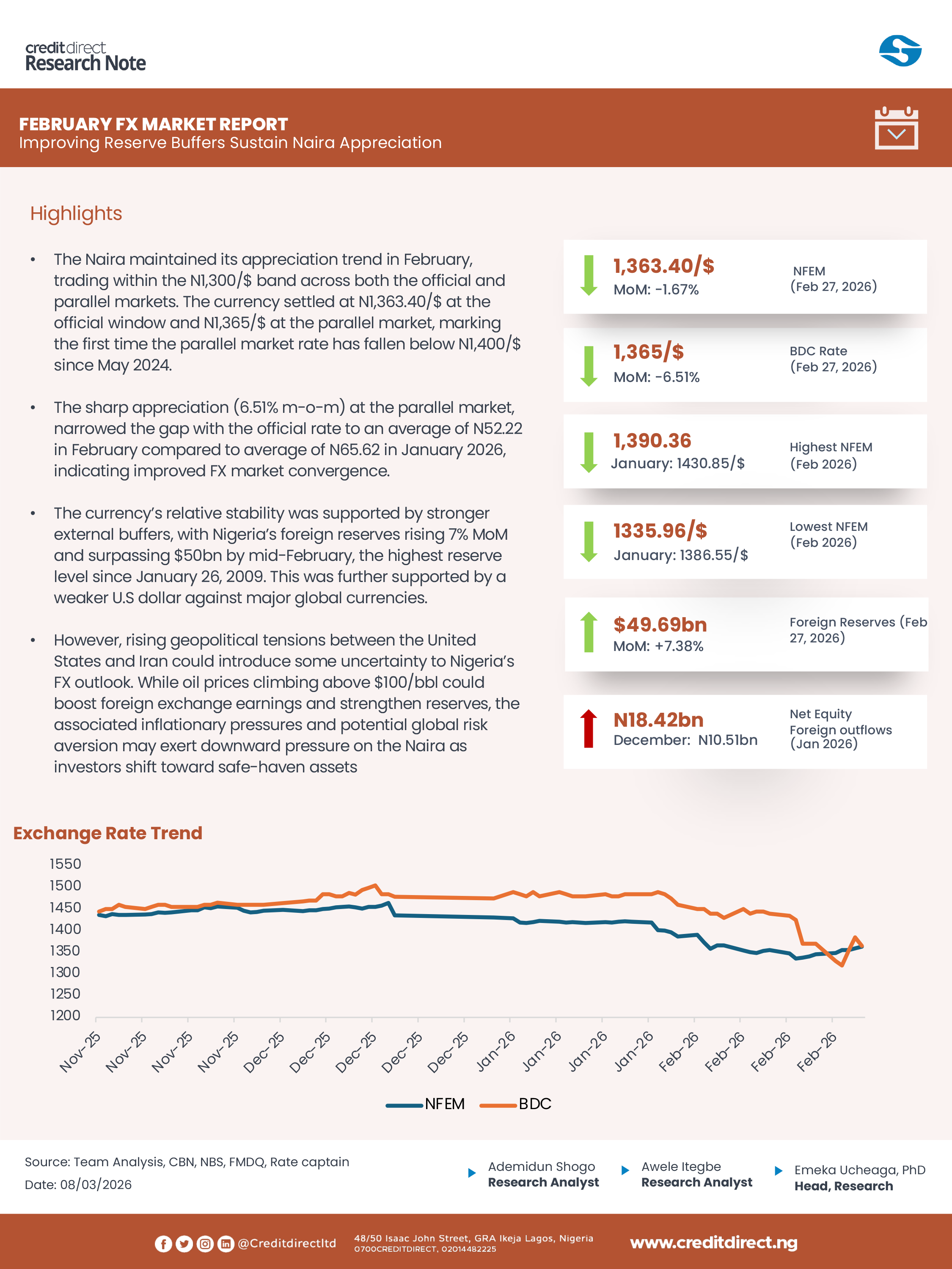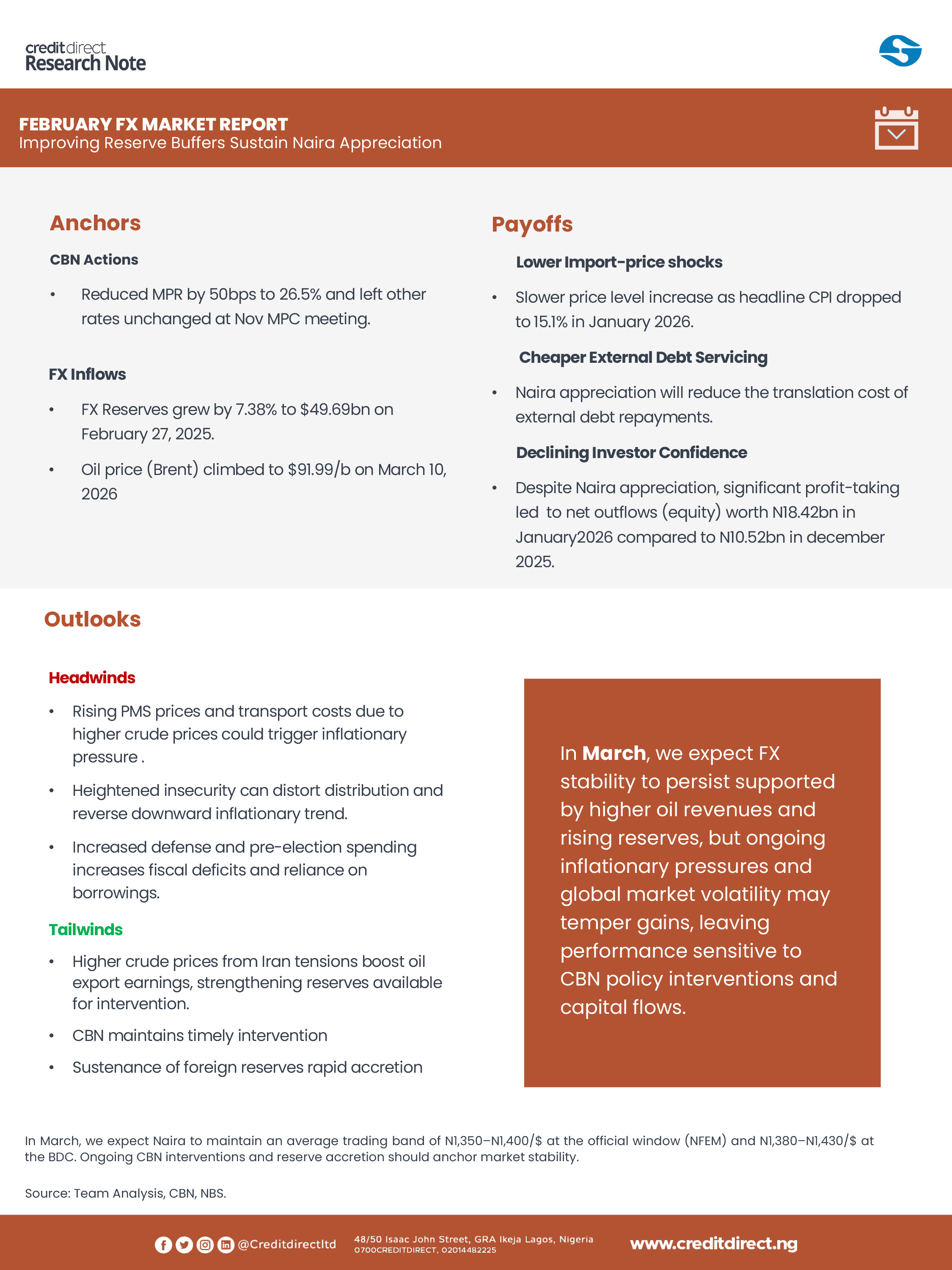 However, several risks could affect this outlook. Rising geopolitical tensions between the United States and Iran could introduce uncertainty, as oil prices climbing above $100 per barrel may increase foreign exchange earnings and strengthen reserves, but also fuel inflationary pressures and heighten global risk aversion. At the same time, rising PMS prices and transport costs, increased pre-election spending, and security concerns could widen fiscal deficits and increase reliance on borrowing. Furthermore, continued investor profit-taking and global market volatility may also weaken capital inflows and place renewed pressure on the Naira despite stronger oil revenues.