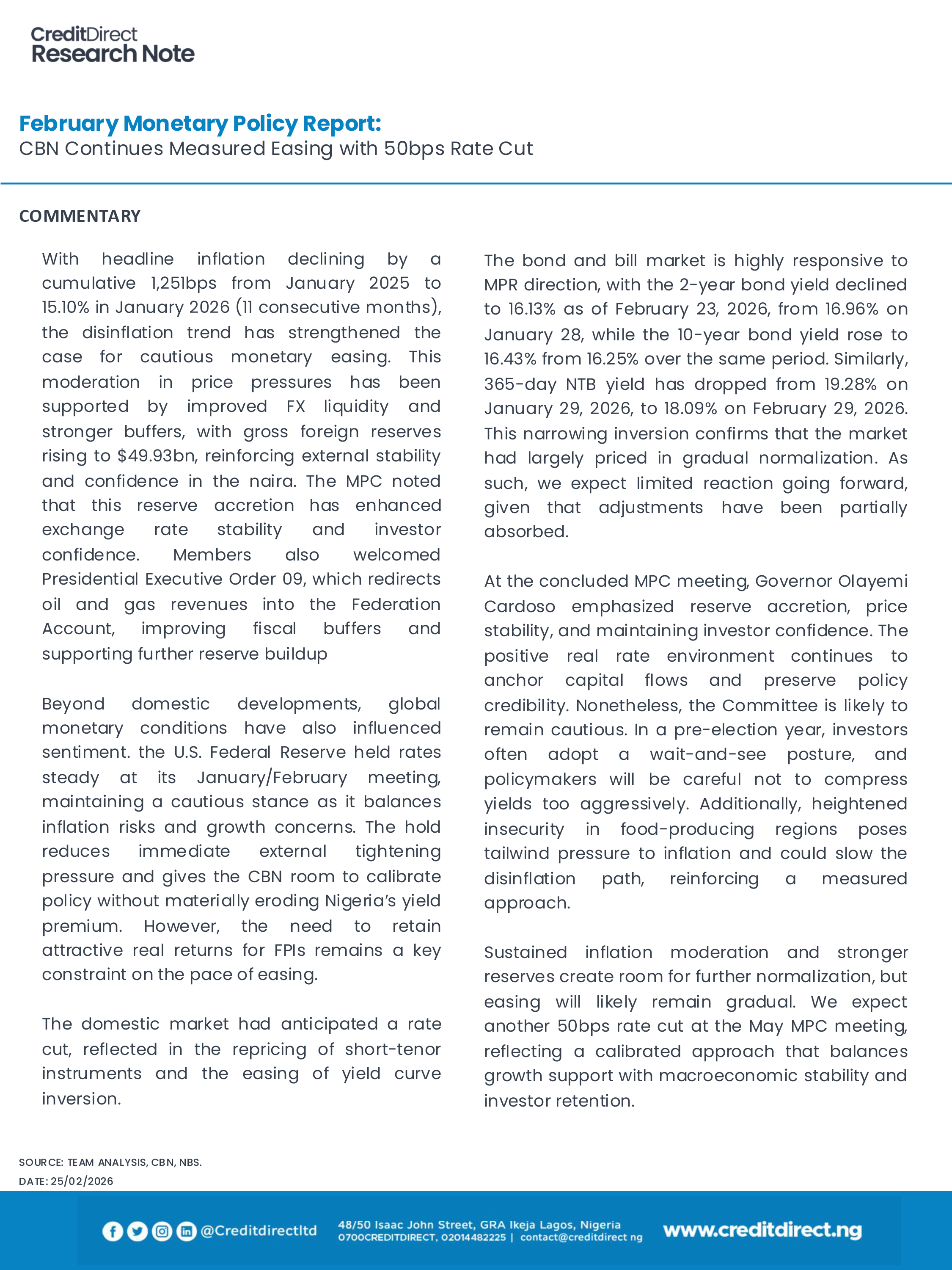 The Monetary Policy Committee continued its cautious easing stance, reducing the Monetary Policy Rate (MPR) by 50bps to 26.5%. Other key parameters were left unchanged, including the asymmetric corridor at +50/-450bps and the Cash Reserve Ratio (CRR) for Deposit Money Banks, Merchant Banks, and non-TSA public sector deposits.