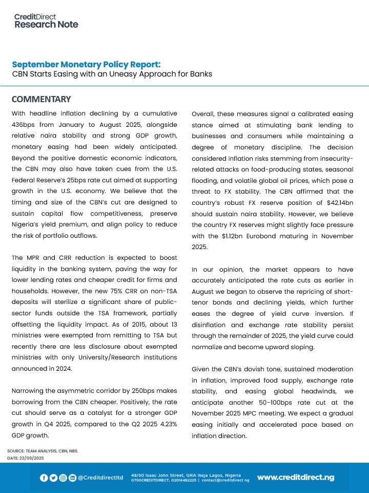 With inflation moderating by 436bps since January and reserves holding steady at $42.14bn, Nigeria is positioned for further cuts in November. If disinflation and FX stability persist, lending conditions could improve significantly, giving households and firms easier access to credit and boosting GDP growth into year-end.
